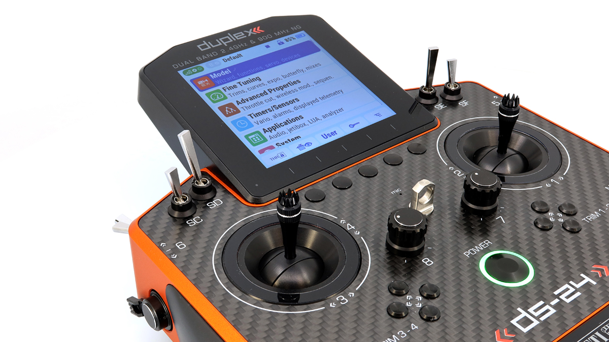 Podsvícený LCD displej umístěný na horní straně vysílače nabízí perfektní čitelnost při jakémkoli osvětlení a velký pozorovací úhel. Díky jemnému rozlišení displeje a použitím velkého množství grafiky bylo možné vytvořit jednoduché a intuitivní nastavování a dále zobrazování telemetrických dat.